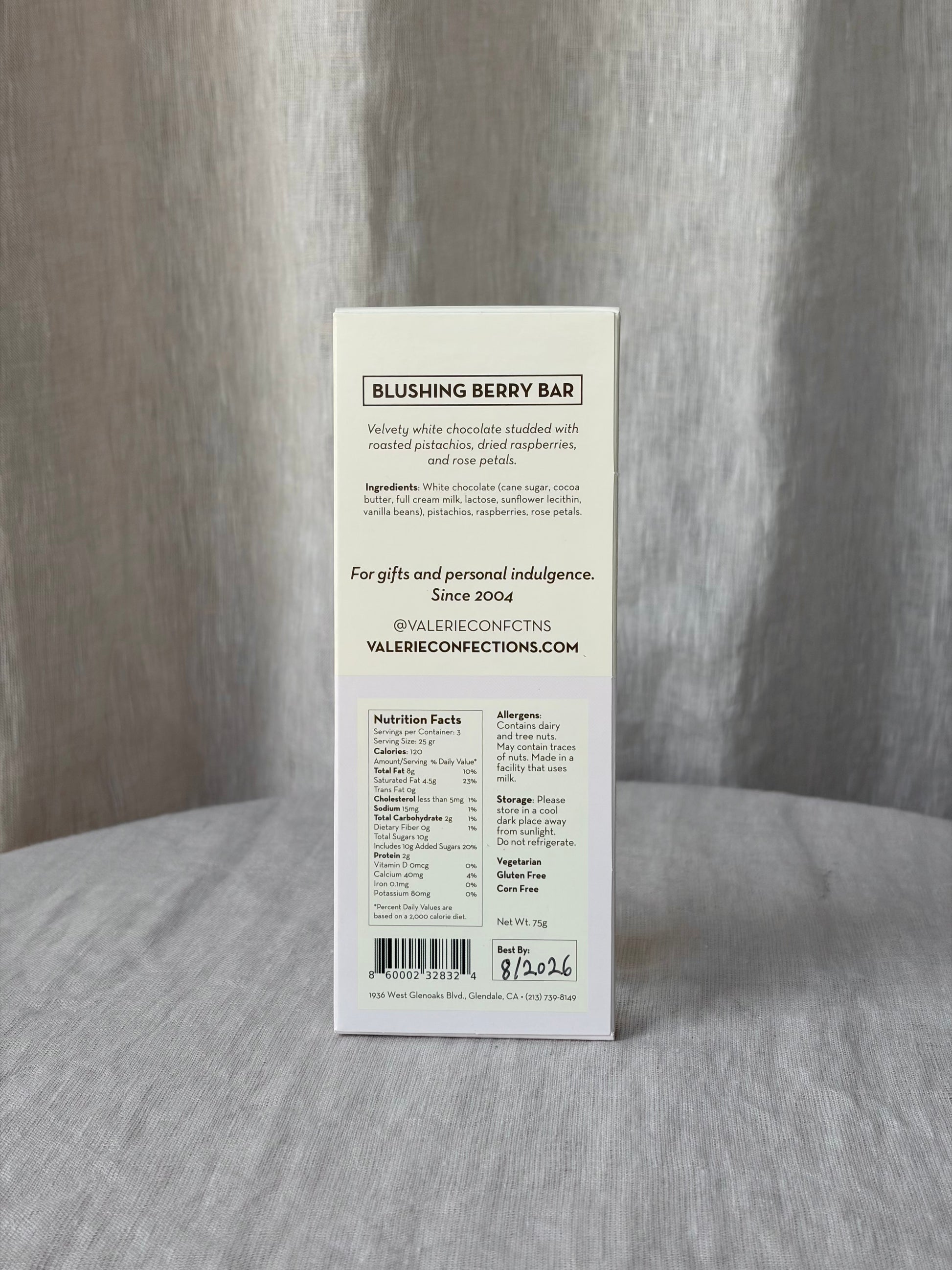 - Ingredients: White chocolate (cane sugar, cocoa butter, full cream milk, lactose, sunflower lecithin, vanilla beans), pistachios, raspberries, rose petals